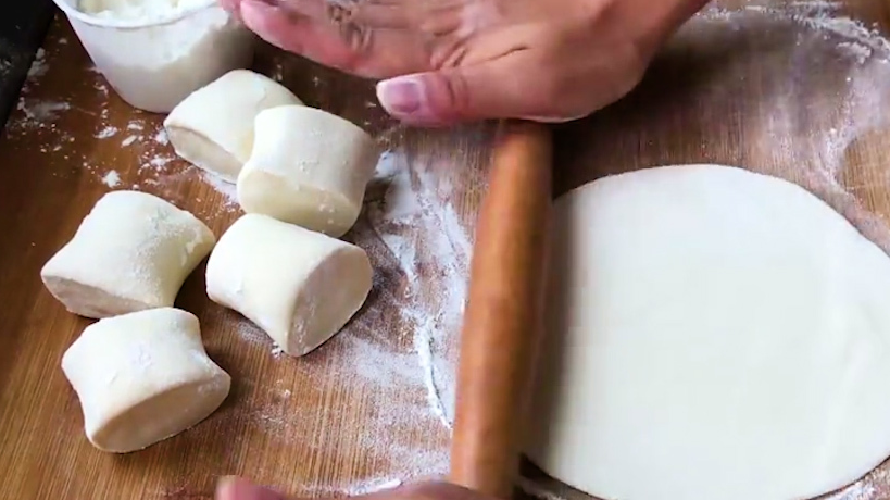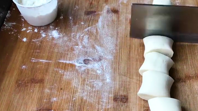 面团醒发好后,就把它拿出来放在案板上用手揉一下,再用刀给它分成两份,搓成长条分成大小相等的面剂。然后把每个面剂用手压扁,再用擀面杖擀成大的薄饼。
