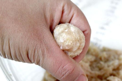 7、用虎口协助,将肉馅团成一个个大小适中的鸡肉丸。