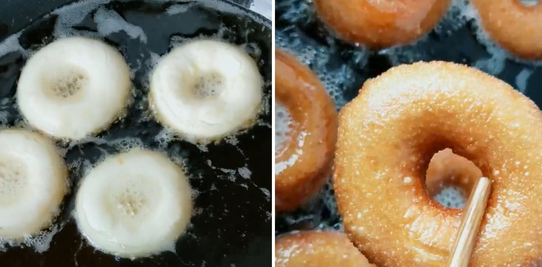 第四步:油温6成热的时候,把刚才做好的甜甜圈放进锅中,炸到鼓起两面金黄即可。哈哈这跟家里炸油条一样,只不过是做成甜的了