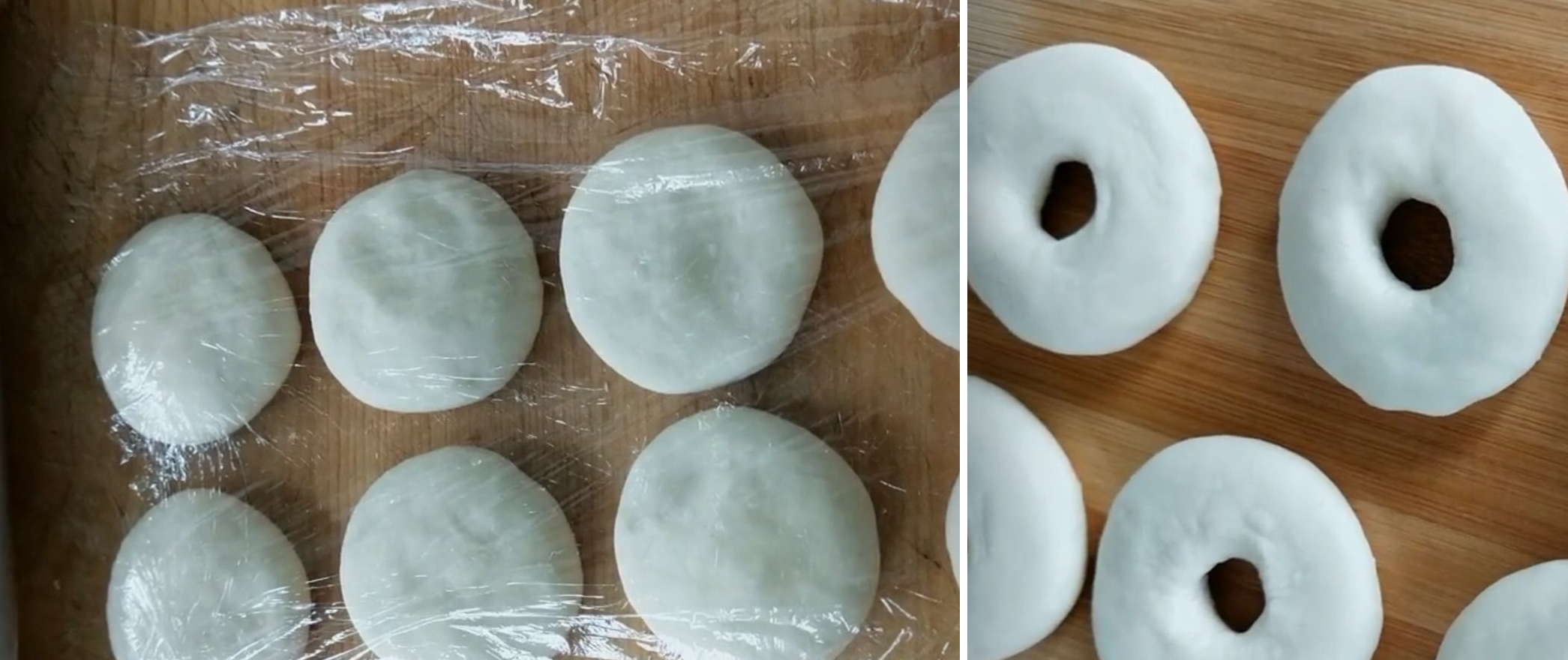 第三步:把做成圆形饼的面,用保鲜膜盖住,再发醒面20分钟,然后用筷子在中间做出一个小洞