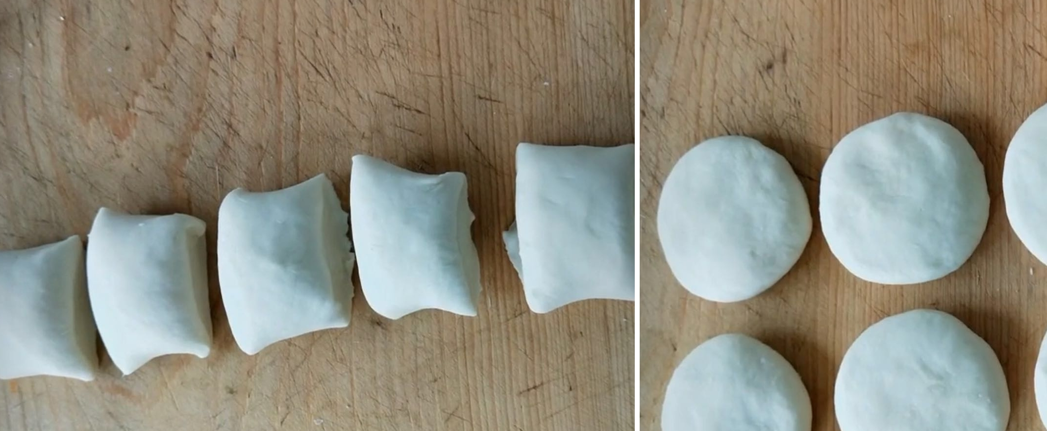 第二步:发好的面揉匀排气,然后搓成长条,切成30克的面团,我的这个正好做了十个,然后口超上,搓成圆形的饼状,