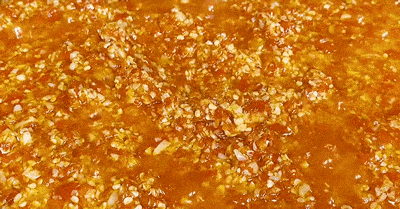 然后往锅里倒入多一些的花生油(约300毫升,也可以多一些),把所有香料也加进来。用花生油做出来的辣椒酱会特别香。