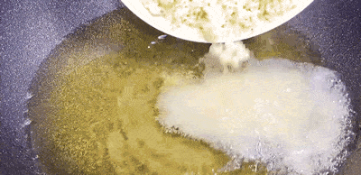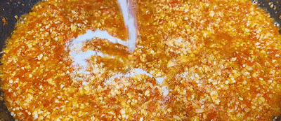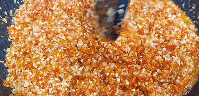 接着把蒜末加进来,用中火把蒜末的水分稍微炸干一些,中途一定要用锅铲不停地翻动,防止粘锅。