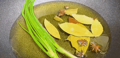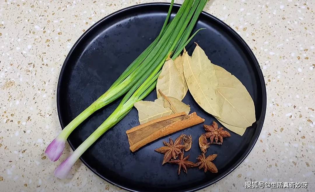 接下来准备 熬制香油。 先来准备香料,两根香葱,一小块桂皮,几颗八角,再来几片香叶,如果家里有香菜或者洋葱,也可以加入几棵香菜或者半个洋葱。