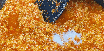 辣椒加进来后,同样要不停地翻拌,防止粘锅,把辣椒里面的多余水分慢慢熬干。 全程千万不能用大火,用中小火就可以了。 如果辣椒酱含水量太多,保质期会大大缩短哦。