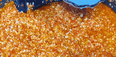 炸至能闻到浓郁的蒜香味以后,再把辣椒倒进来,继续翻拌均匀,用中火慢慢熬。