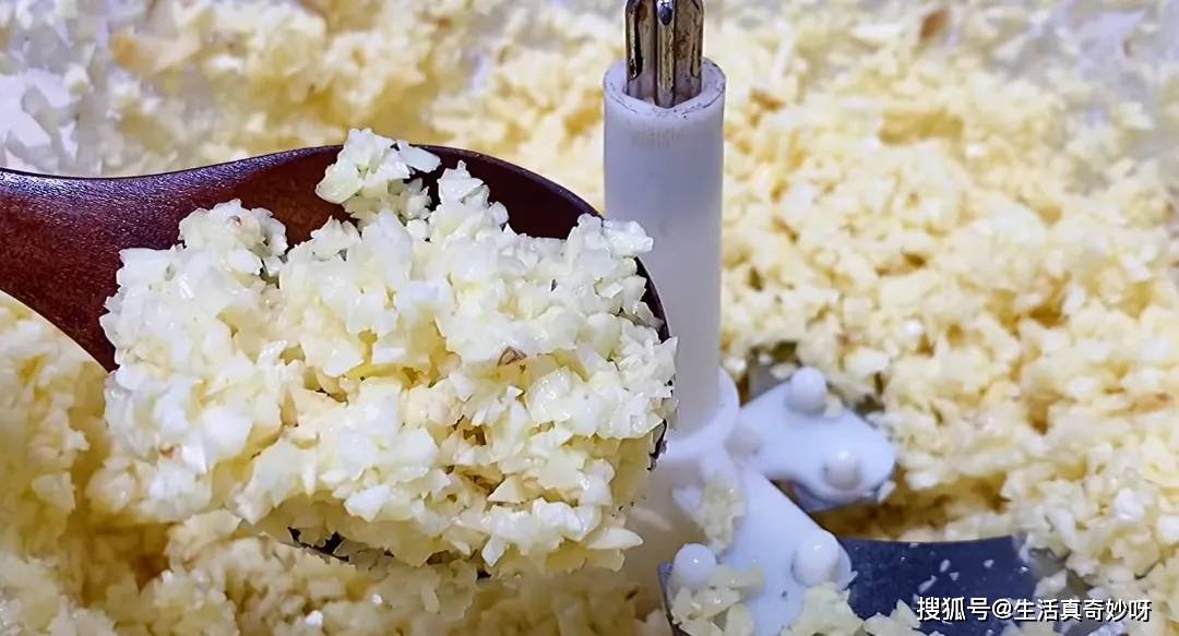 蒜末不用打得太碎,像下面这样,有一些颗粒感就可以了。打好以后,装入碗中备用。