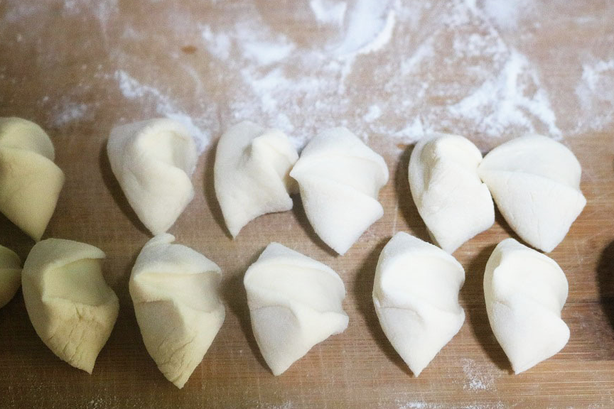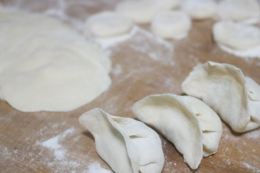 10,把小剂子擀成中间稍厚,边上稍薄的饺子皮,然后包入馅料。锅内提前烧水,待所有饺子包好,就可以下锅煮饺子了。