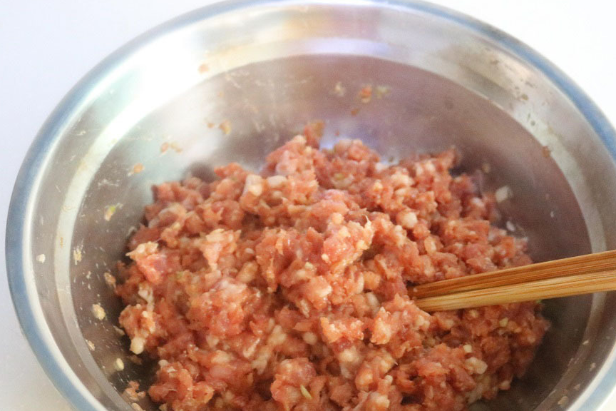 3,用筷子沿一个方向把所有调料搅拌均匀,如果有时间可以用筷子沿同一个方向多搅一会,这样调出来的肉馅口感更弹。