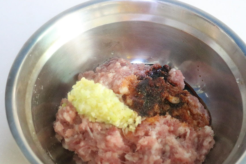 2,猪肉洗净,剁成肉糜,然后加入少许的盐、老抽、生抽、胡椒粉、五香粉、葱末、姜末。