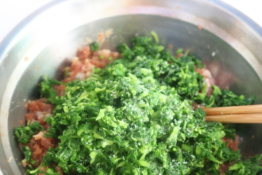 7,把苋菜倒入肉馅内,然后加入食用油、适量盐、少许香油调味。