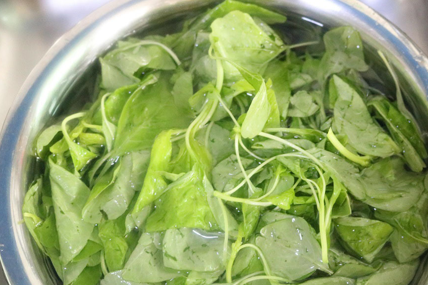 4,苋菜摘掉底端稍老的部分,剩余的菜叶部分用清水多淘洗几遍,直至淘洗干净,然后捞出沥干水分。