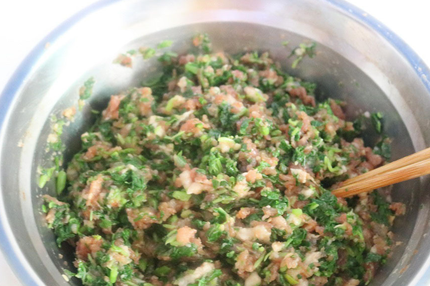 8,沿同一个方向用筷子把馅料拌匀。