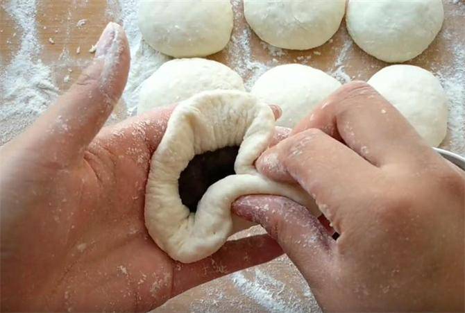 5.我们在案板上放一些干面粉,把面剂按薄包入豆沙馅,用包包子的方法收口,虎口转动捏紧,防止豆沙馅露出。