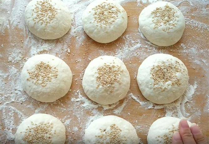 6.在饼坯上刷少许的水,撒上芝麻,轻轻的按压使芝麻粘的更牢靠,作为点缀,做好的饼坯再醒发十分钟。