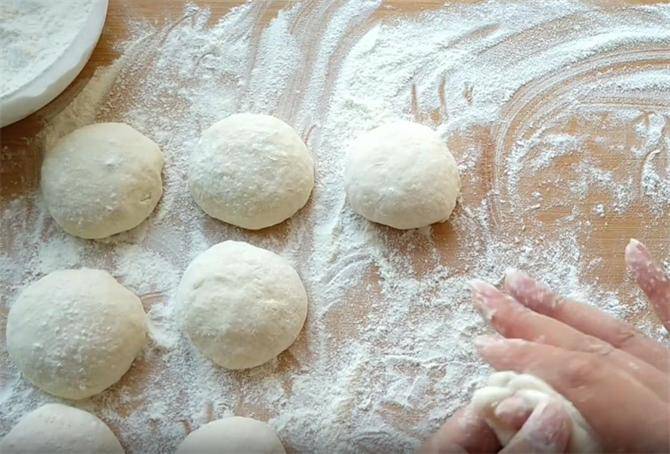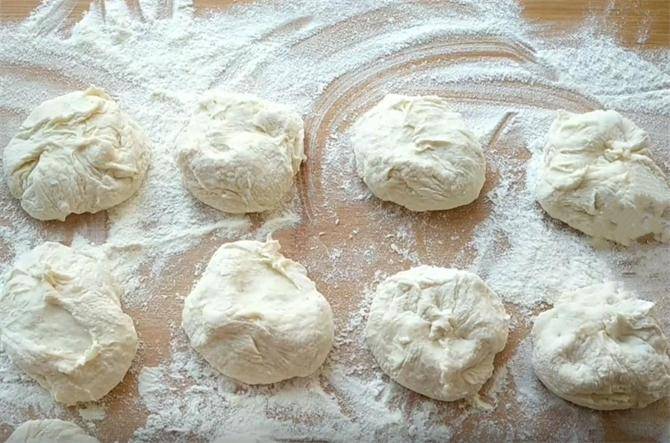 3.然后我们在案板上多放一些干面粉,把发好的面糊倒在面粉上,利用干面粉把面糊整理成长条形,防止粘手粘案板,然后用虎口掐断面糊,下十个左右的面剂。