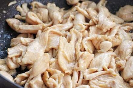 第三步,等鸡胸肉腌制完便可下锅炒至半熟,然后捞出做备用