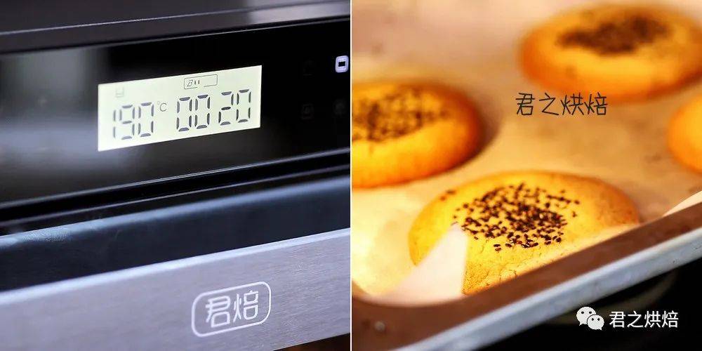 烤箱预热好以后,将烤盘放入烤箱中层,大约烘烤20分钟。烘烤时间要根据烤箱的实际情况进行调整。烤到金黄色就可以出炉了。