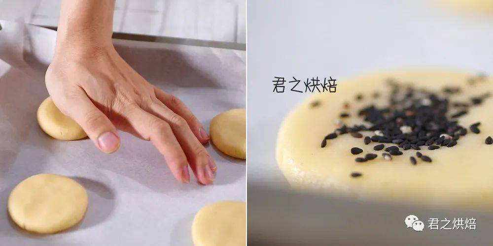 面团放在铺了硅油纸的烤盘上压扁,撒上黑芝麻作为装饰(用手压一压使黑芝麻贴紧在面饼表面)。