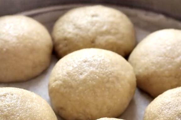 1:和面时,先用热水烫一下玉米面,这一步可以使包子更加的暄软细腻,再加上酵母、面粉和温水,揉成一个面团,醒发60分钟。