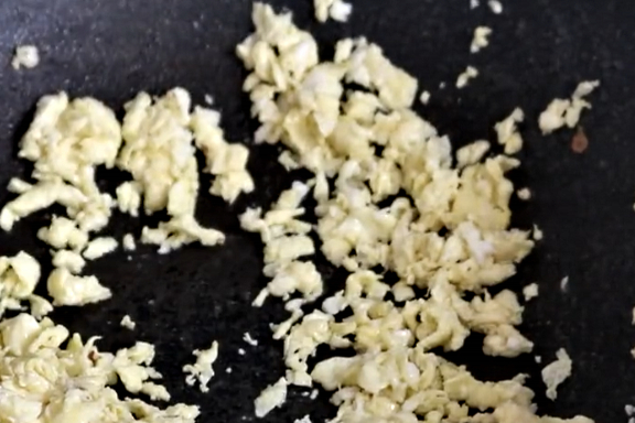 第三步:在小碗中打上鸡蛋3个搅散,把葱白切成葱花,在锅里倒上油,放上一小把虾皮炒出香味,把虾皮炒到微黄出锅,另起锅倒上油,把鸡蛋液倒进去,炒成鸡蛋碎出锅。