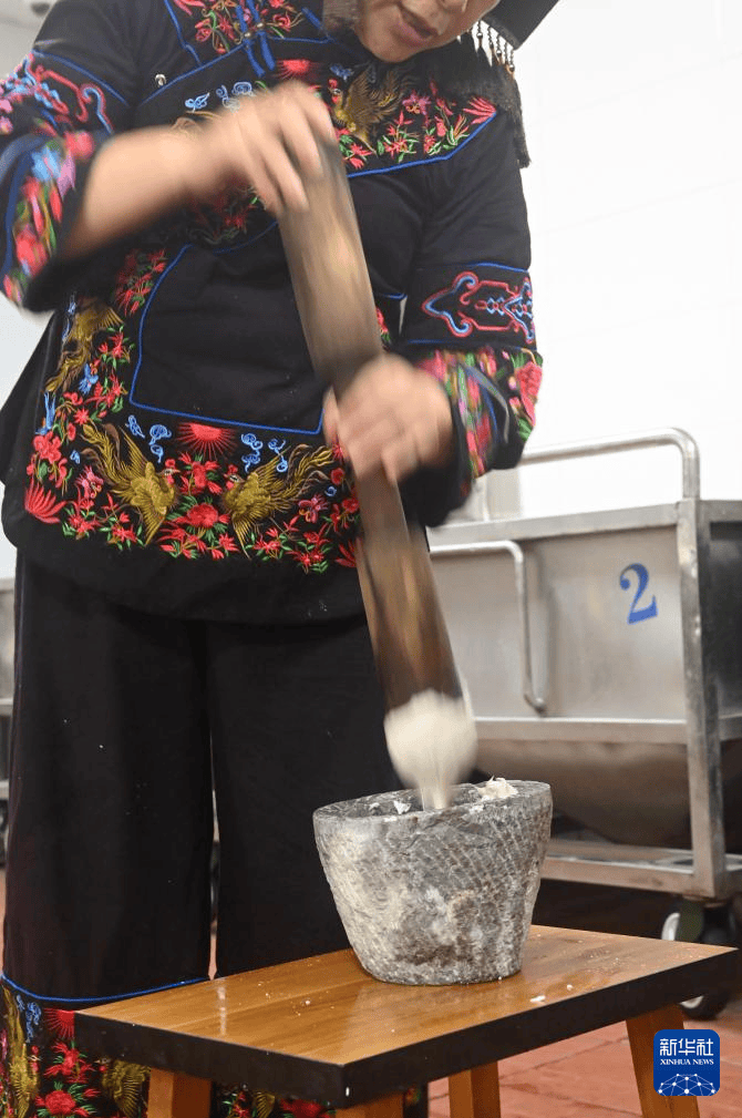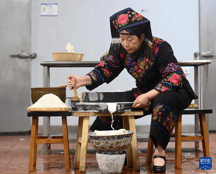 8月13日,黄天玲在广西南宁市舂粉准备制作生榨米粉。新华社记者陆波岸 摄