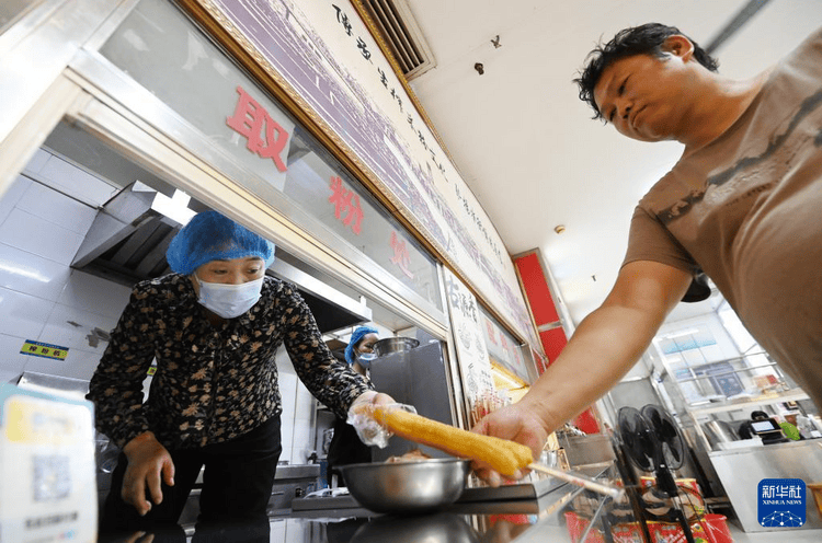 8月14日,黄天玲(左一)在广西南宁市水街一家米粉店里给顾客的生榨米粉加油条。新华社记者陆波岸 摄