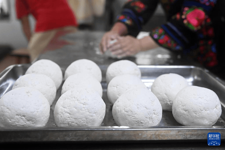 8月13日,黄天玲在广西南宁市搓揉准备制作生榨米粉的粉团。新华社记者陆波岸 摄