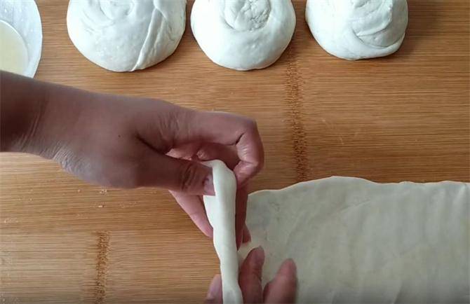 5.把折叠好的面积再次伸长,像这样向两端按压排出空气,然后边向后拉伸边卷起,最后收尾的时候压在面筋的底端。