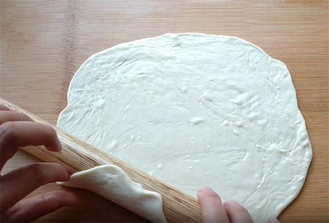 7.我们把面饼按薄,然后正反面把它擀薄擀圆,由于这个饼比较软,所以说我们要用擀面杖卷起下锅,这样能够保持饼的形状不变。