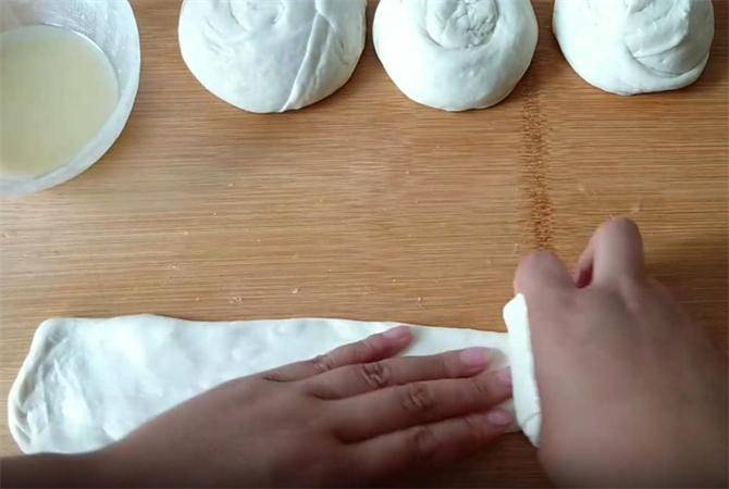 4.像这样用手把面剂抻长按扁,均匀的涂抹上油酥,然后边向后拉伸边折叠,折叠的次数越多,做出的层次就越丰富。