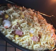 8、撒上火腿丁,虾仁,然后再撒上芝士。