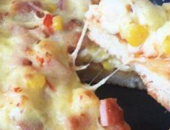 材料:面粉150g,糖10g,牛奶适量,酵母适量,番茄酱/披萨酱、熟玉米粒,火腿丁,虾仁