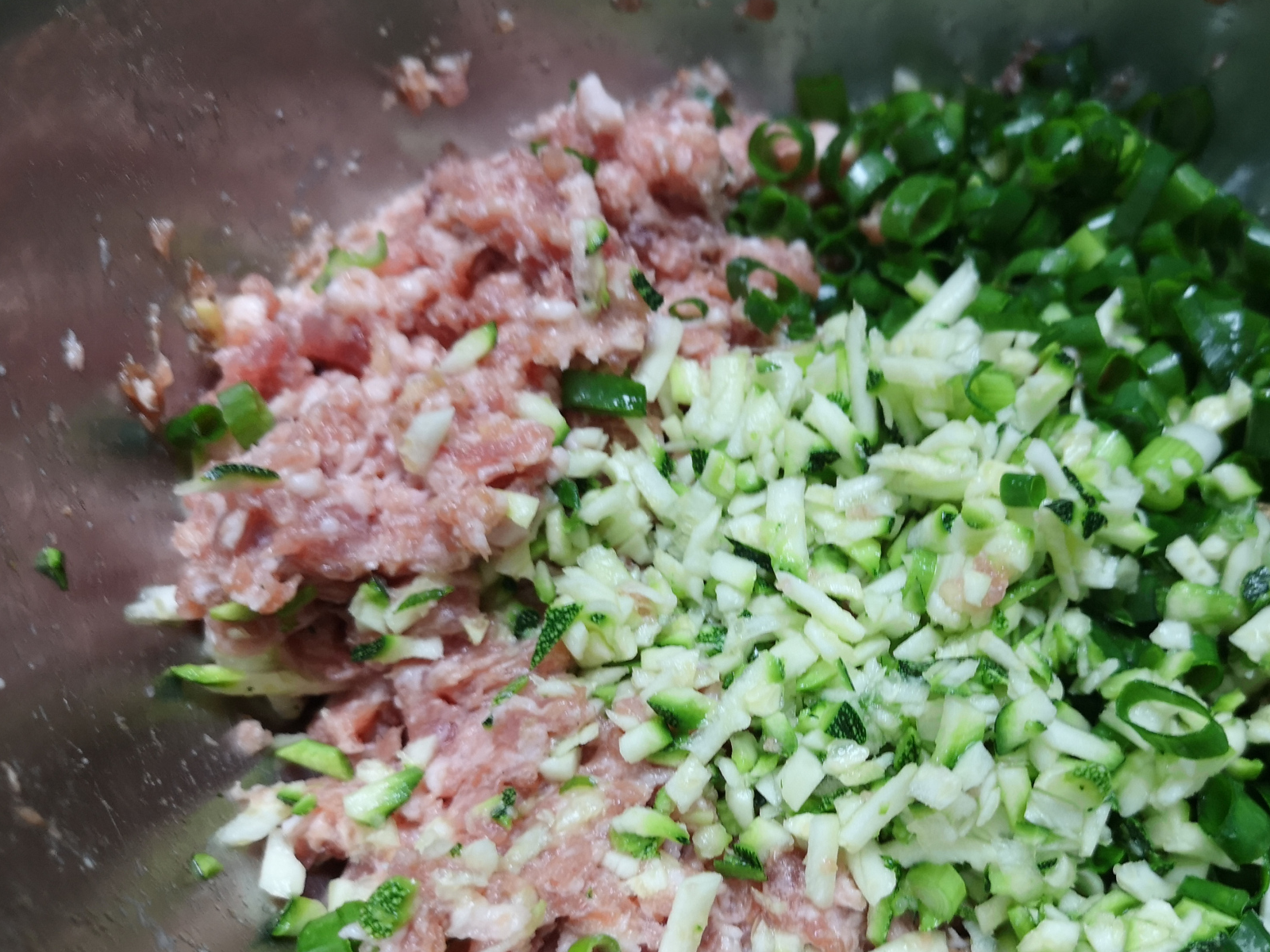 1、猪肉购买的时候,让店家打成肉馅儿。肉馅中分2~3次加入适量的清水,顺一个方向搅拌均匀,每次都要等到肉馅将水分吸收后再加下一次。肉馅中放入适量的胡椒粉,生抽,姜末,搅拌均匀腌制10分钟。加入适量的西葫芦碎,葱花。