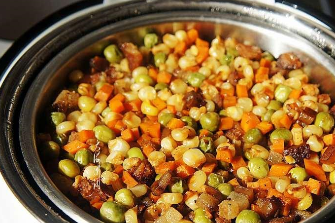 2、如果配菜都是熟菜不要同时和米一起焖,最后10分钟足够了,否则时间太长,蔬菜营养价值会降低,而且口感不好。