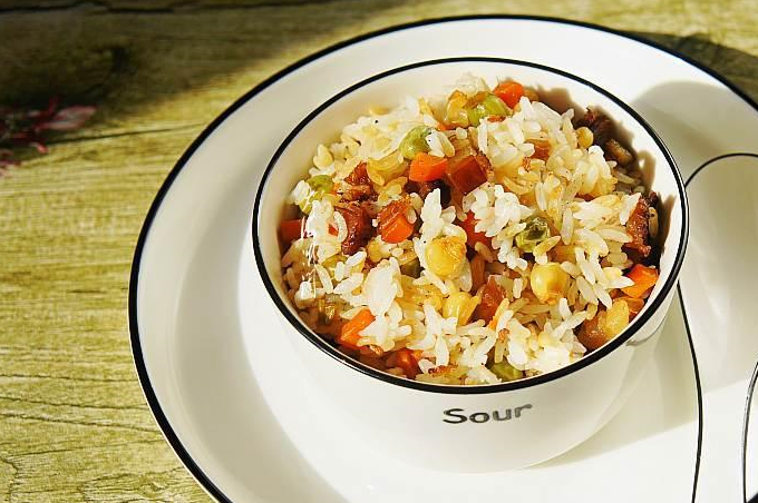 【腊肉焖饭】所需食材:大米200g;玉米粒1小盘;豌豆粒1小盘;胡萝卜半根;腊肉1块;油适量;盐适量;葱适量;五香粉适量;胡椒粉适量;味极鲜酱油适量。