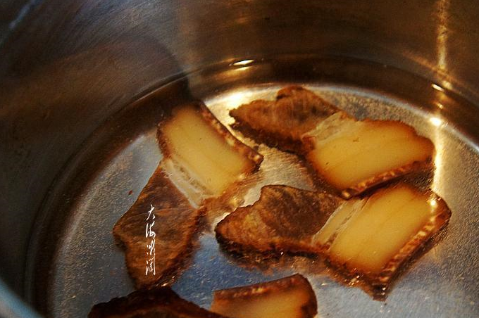 3、腊肉切片,锅中加入适量的水,下入腊肉片煮至瘦肉变软,把肥油煮出来,这腊肉就香而不腻了。