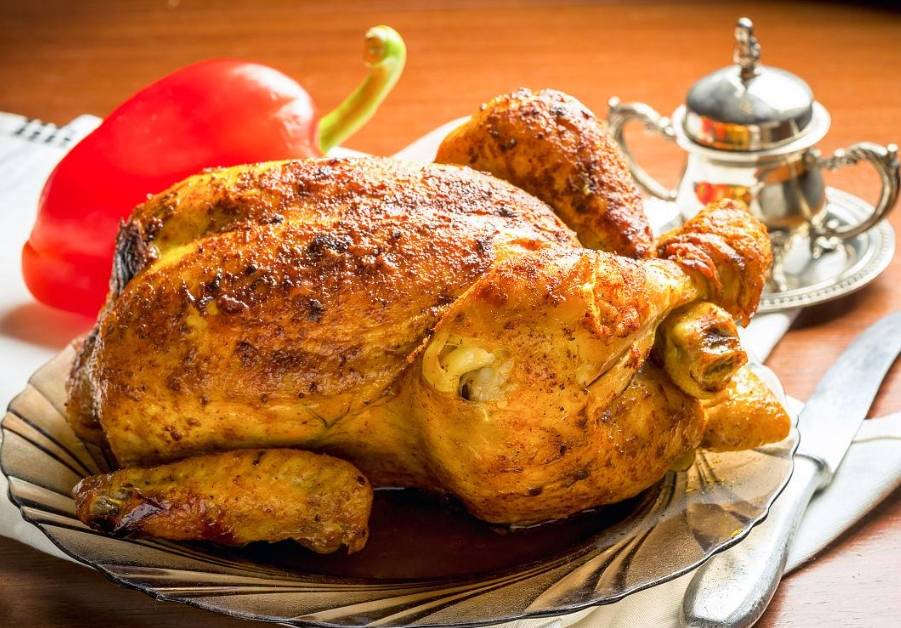 将腌制好的整鸡放入烤盘,放入预热好的烤箱中,烤制约 1.5 至 2 小时,或直到鸡皮呈现金黄色且鸡肉熟透。