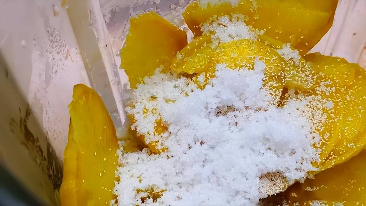 2.红薯蒸好后取出,晾凉后把它放到料理机内(约180克左右),接着倒入150克牛奶,再加入5克酵母和1勺白糖,再将其打成红薯泥后倒入盆中备用。白糖的量可以稍微多一些,会更甜。