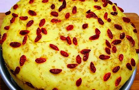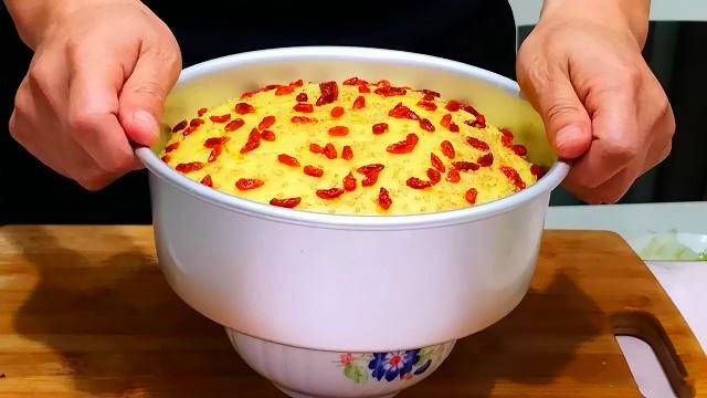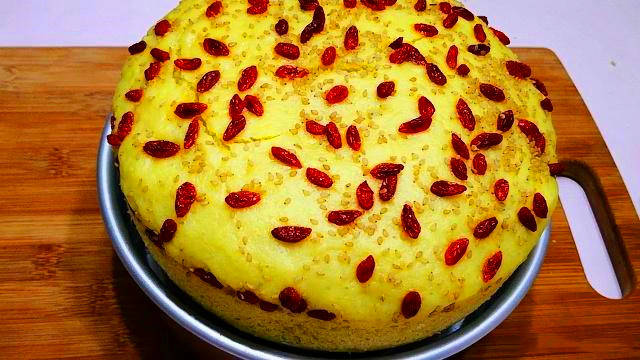 6.二次醒发好后,将其放到蒸锅中,凉水上锅开始蒸,水开后继续蒸30分钟左右关火,再焖3~5分钟后即可开锅取出。冷却至不烫手后脱掉模具,像切蛋糕一样切成小块,便可以上桌享用了。
