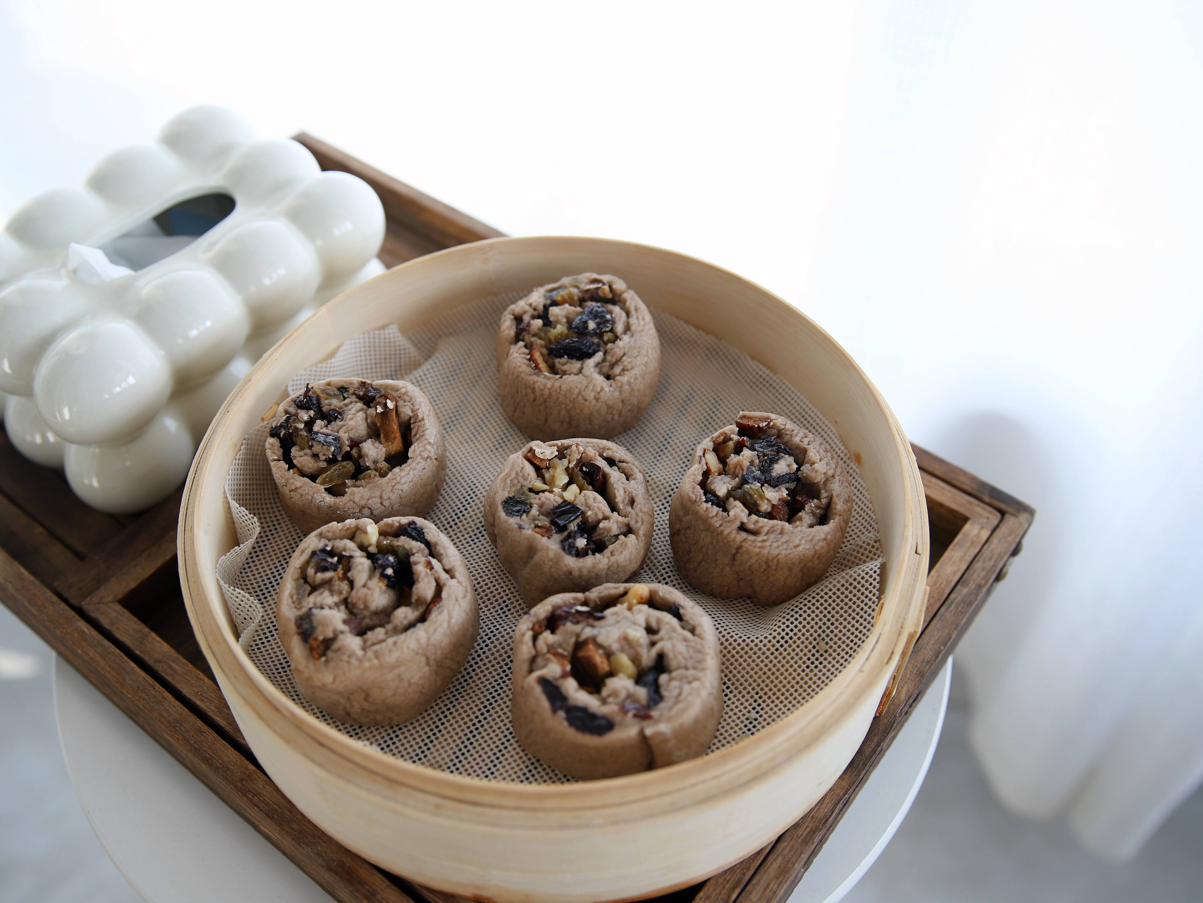 用料:荞麦粉500克,清水270克,酵母粉5克,葡萄干适量,红枣适量,熟核桃碎适量。