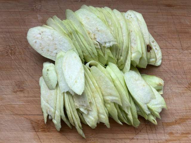 1、准备2个新鲜的茄子,把外皮削掉,先改刀切成薄片,然后再切成细长条剁碎一些。茄子新鲜里面的水分多,撒上一小勺的食盐拌均匀,把茄子里面多余的水分腌出来,腌十分钟后攥干水分备用即可。