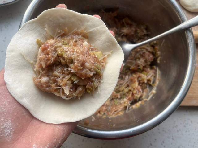 4、用冷水和一个软一些的面团,这次烙馅饼是发面的,发面的好吃喧软。面团发酵30分钟后取出来揉搓排气后揪成小一点的剂子,摁压好后擀成薄一点的饼胚,往饼胚内放入适量的菜馅,像包包子一样包成小小的包子胚就可以。