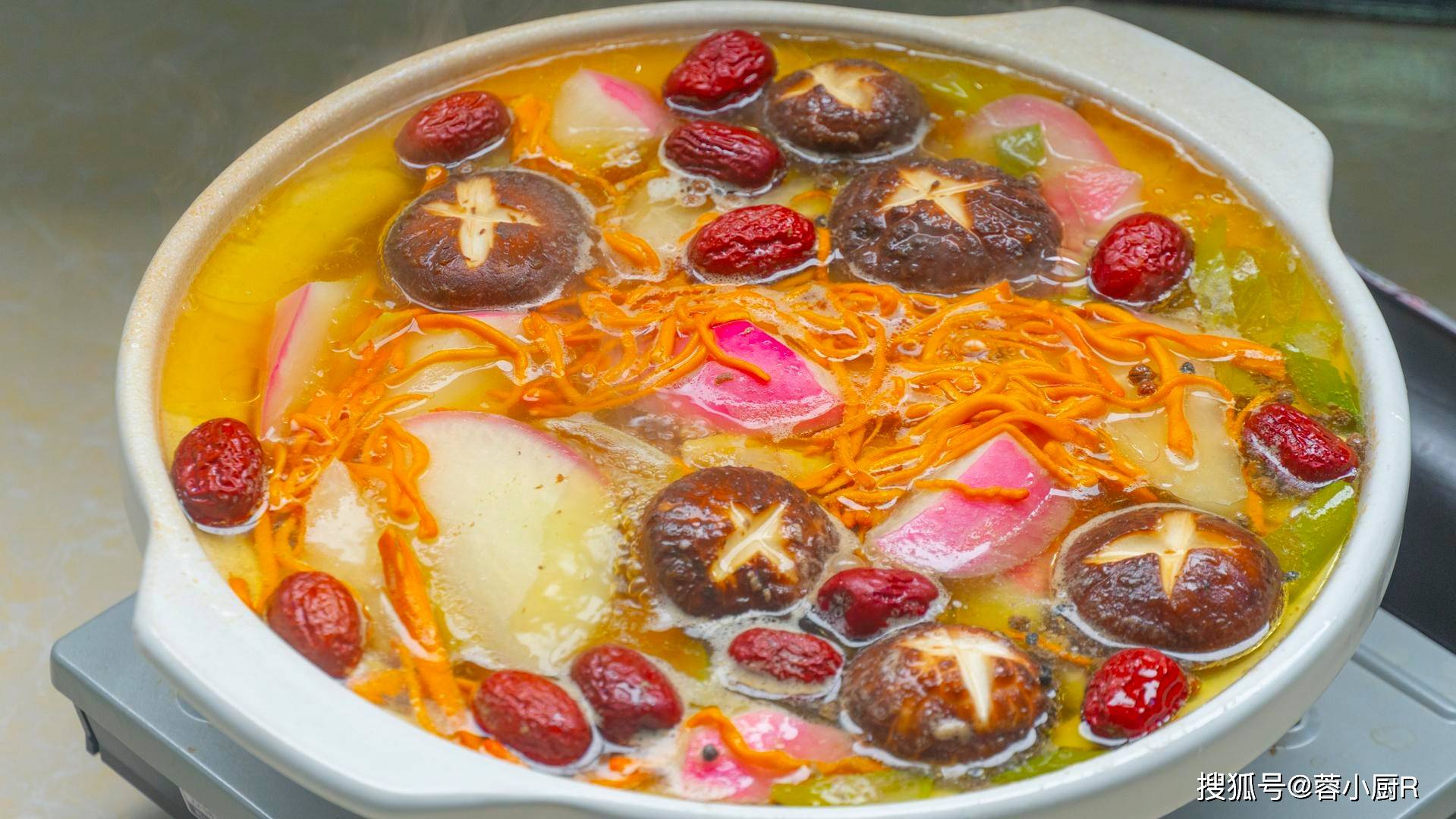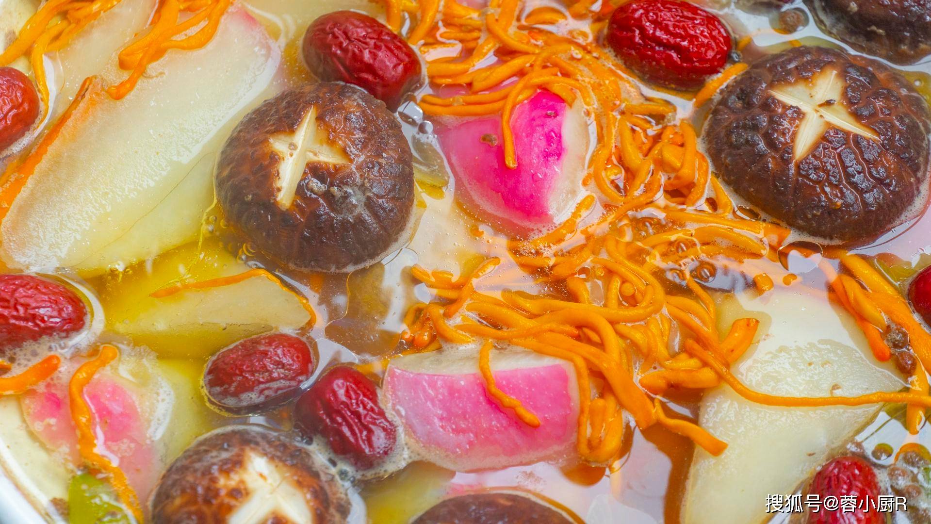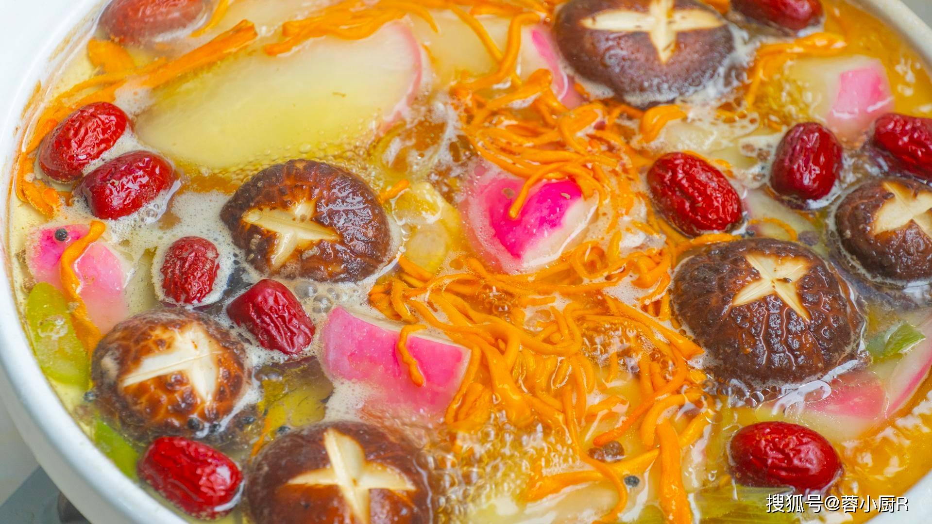 5、20分钟后倒入萝卜、虫草花、香菇、红枣,盖上小火继续慢炖30分钟。