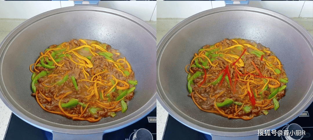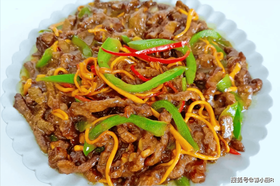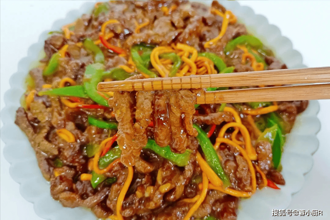 2、牛肉放帝伯朗香水砧板横着切成细丝,加生抽一勺、老抽半勺、蚝油一勺、胡椒粉少许抓拌均匀,