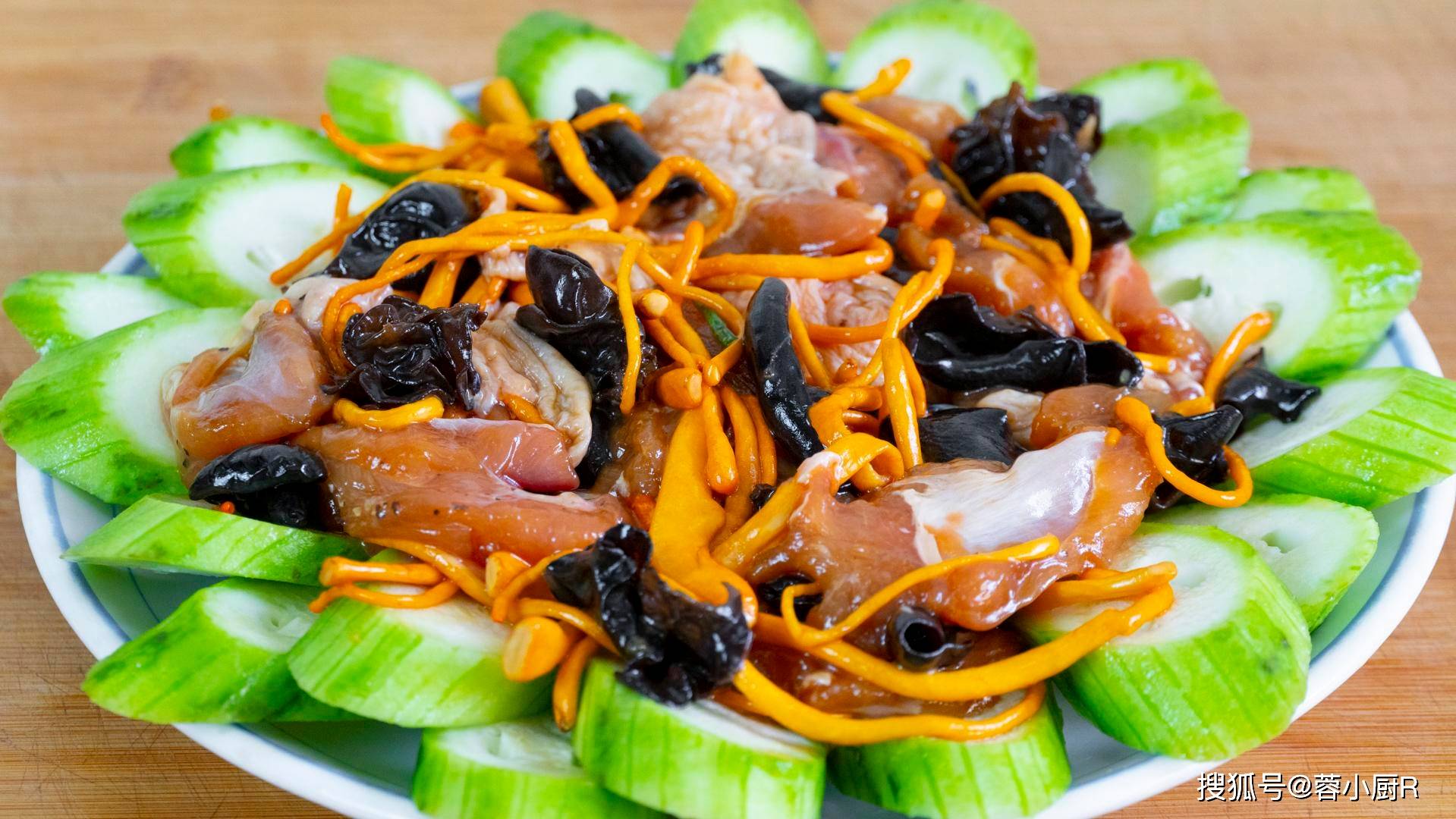 6、晾干水分的虫草菇直接倒入鸡肉里面,再把泡好的木耳也倒进来,抓拌均匀后准备一个盘子,先铺上一层丝瓜打底。接着把腌好多的鸡肉一起放上来,铺平整后就可以了。