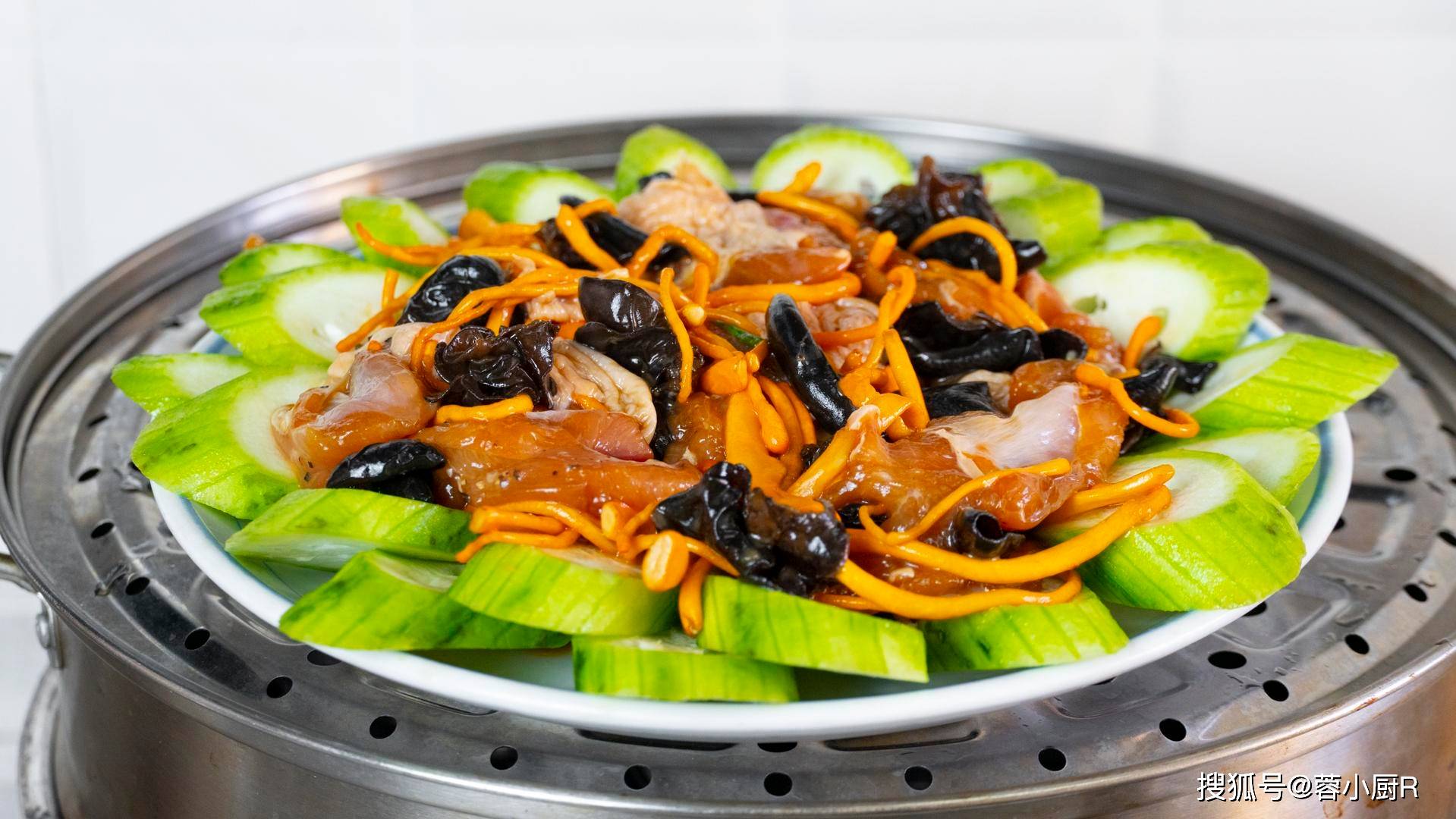 7、起锅烧水,水开放入丝瓜鸡肉上锅蒸,大火蒸10分钟。