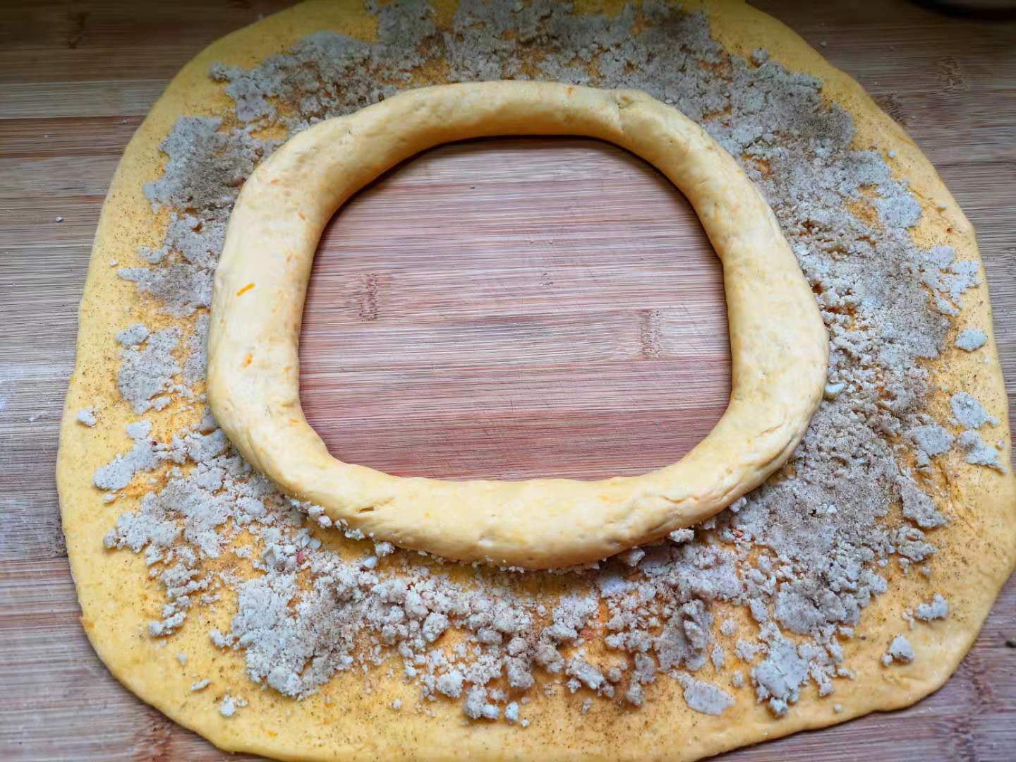 5、案板抹少许油,把面团擀成薄片,撒上花生末,再撒上适量椒盐,喜欢吃甜的可以撒上白糖,从面团的中间戳个洞,从里向外卷起来。