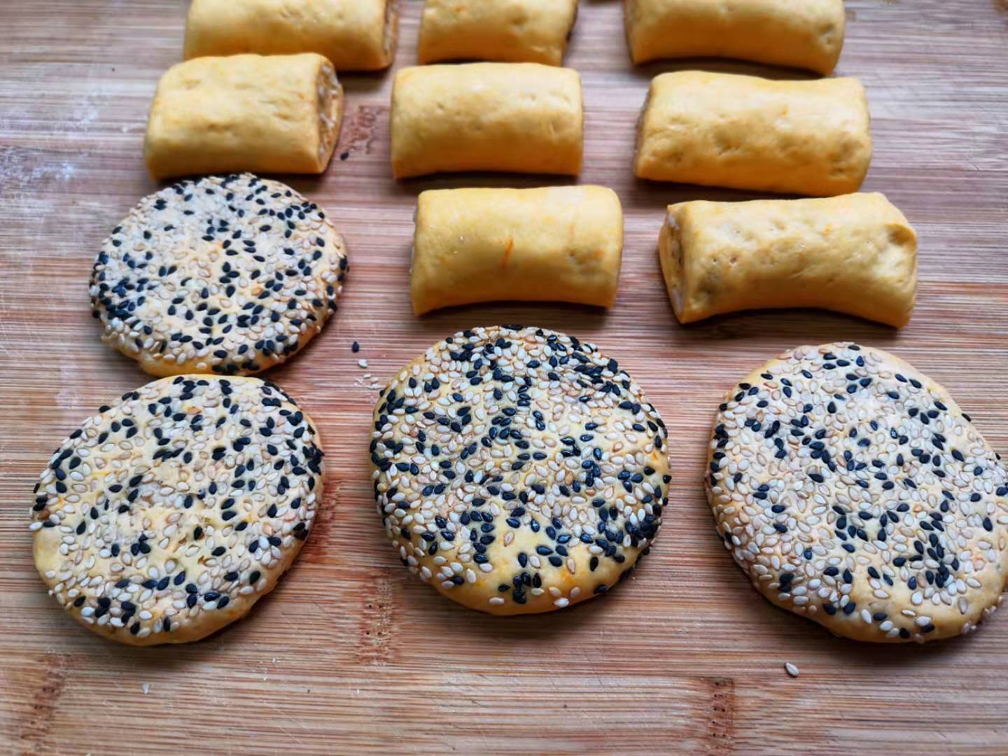 食材:南瓜1块、花生米1小碗、面粉300克、酵母4克、黑白芝麻适量,食用油2小勺、椒盐适量。