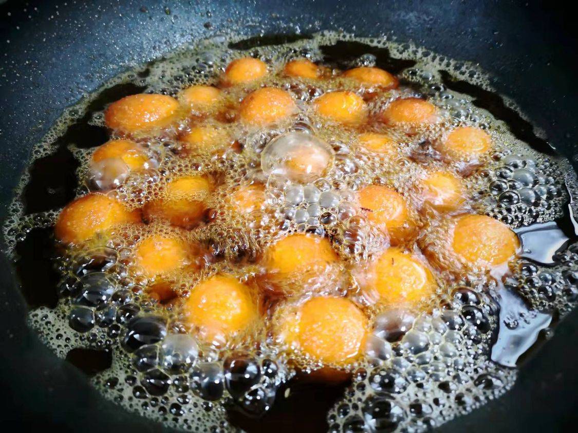 5、锅中倒入油,把油烧至6成热,放入准备好的丸子小火慢炸,防止火力过猛,过程中不停翻动丸子,丸子上浮炸至颜色金黄即可,捞出来沥干油,给孩子当零食,真的太好了,喜欢的朋友不妨也试一试。